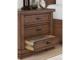 Casual lifestyle design. Made with hardwood solids, Mango wood veneer and MDF substrate. Finished in a rich brown wood tone. Cases feature spacious inset picture framed drawers with fully finished interiors, French/English dovetail construction and heavy duty ball-bearing side glides. Top drawers have black felt bottoms. Stylish modern drawer pulls are finished in a matte black accent color. Panel storage bed features a stylish board and baton effect with an inset metal fret for a modern take on casual design. The storage drawers in the footboard offer extra deep space for storing larger bedroom essentials. Full roll slat foundation for mattress only. No foundation box spring required. Three drawer nightstand includes a 110V power supply with dual USB charging ports.