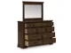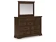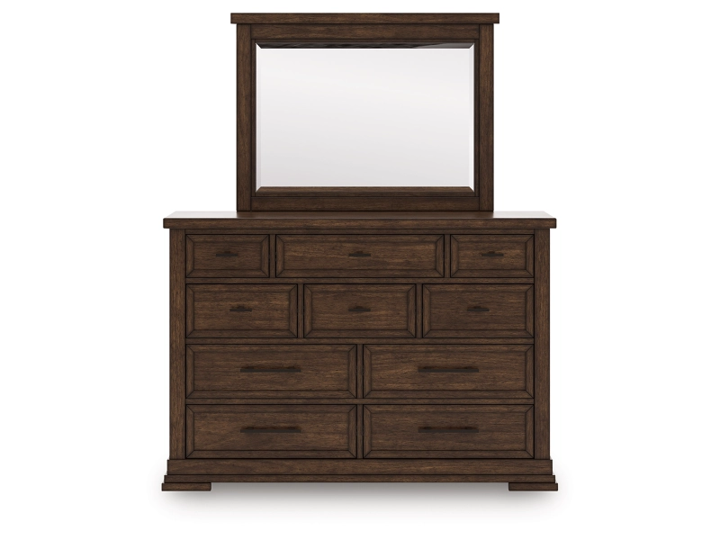 Style, simplicity and charm are hallmarks of this dresser with mirror. Created with casual spaces in mind, it has the versatility to suit styles from craftsman to modern farmhouse. The rich brown finish aligns with your refined-meets-relaxed approach to everyday style. And for a timeless touch, ten drawers in various sizes to accommodate your needs are complete with picture frame detailing.