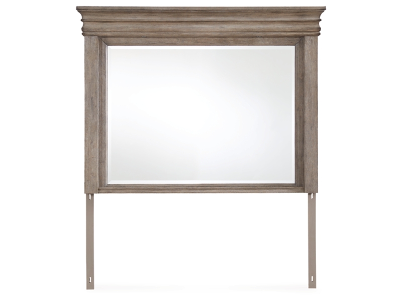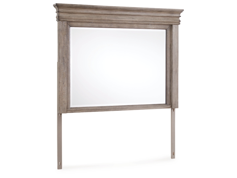 Casual Traditional styling. Made with hardwood solids, Oak and Ash veneer, cast resin components and engineered wood substrates. Light warm grayish brown glazed wood finish. Cases feature break front pilasters, inset framed drawers and inlayed Ash veneer borders on tops. French/English drawer construction with fully finished interiors and metal ball-bearing side glides. Round metal drawer knobs with a satin nickel color finish. B916-57/58 mansion style panel bed features classic decorative pilasters, inset picture framed panels, and an overhead light bridge with 2 LED puck lights for cozy ambient lighting. The three drawer nightstand includes a 110V power supply with dual USB charging ports. Mirror frame features a light bridge with 2 mini LED lights.