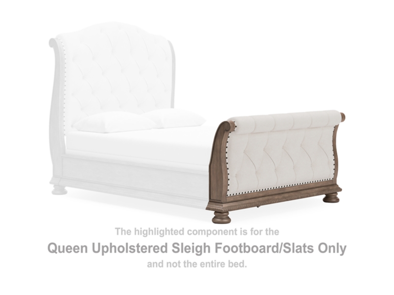 This queen upholstered sleigh footboard with slats is made with solid wood frames, an upholstered foam cushion and engineered wood slats. Pairs with other items in the series to make a bed kit.