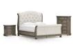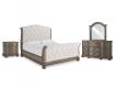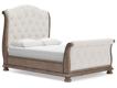 Elegant traditional styling. Made with hardwood solids, Oak and Ash veneer, MDF substrates and cast resin components. A sophisticated light brown finish is artfully glazed for an antiqued look. Cases feature serpentine shaping with thick profiled tops and framed drawer fronts. Tops feature book matched veneer with contrasting Ash swirl inlay border. Drawers feature dovetail construction, fully finished interiors with heavy duty ball-bearing side glides for smooth function. Upper drawers have felt bottoms. Shapely upholstered sleigh bed with tufted headboard and footboard cushions in soft white chenille fabric. The three drawer nightstand includes a 110V power supply with USB-A and USB-C charging ports.
