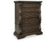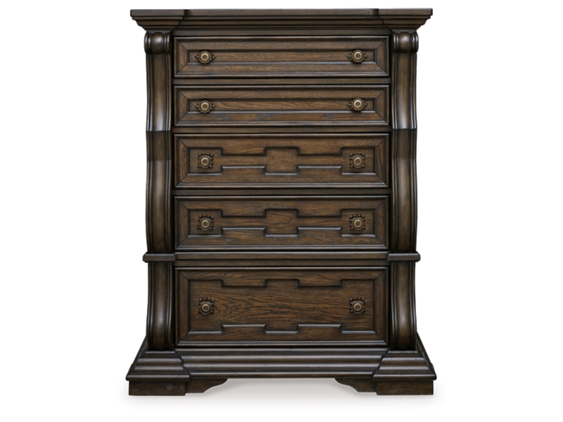 From its ornamental appliques to its large scale, this chest of drawers makes a bold statement. Spacious drawers store your clothes and more in stunning style. The look is timeless. The feel? Right at home.