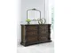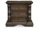 Opulent Traditional styling. Inspired by the grandeur and grace of Old World traditional style, this bedroom collection is nothing short of stunning. A choice blend of materials is accented by detailed ornamental appliques and large-scale decorative scrolled pilasters make a grand stance. Made with hardwood solids, oak and ash swirl veneers with MDF substrates and cast resin components. Finished in a dark brown coloration. The panel bed features sculptural ornate details upholstered headboard and footboard is covered in a button tufted softly textured chenille in a pewter color. Poster bed features grand mansion style posts and metal canopy with sculptural ornate details, upholstered headboard covered in a button tufted, softly textured chenille in a pewter color. Top of cases include an ash swirl border and dark walnut inlay. Accented with antique gold toned drawer pulls. Three drawer night stand features a concealed drawer for keeping valuables out of sight and includes a 110V power supply with dual USB charging ports.