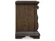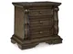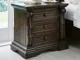 Opulent Traditional styling. Inspired by the grandeur and grace of Old World traditional style, this bedroom collection is nothing short of stunning. A choice blend of materials is accented by detailed ornamental appliques and large-scale decorative scrolled pilasters make a grand stance. Made with hardwood solids, oak and ash swirl veneers with MDF substrates and cast resin components. Finished in a dark brown coloration. The panel bed features sculptural ornate details upholstered headboard and footboard is covered in a button tufted softly textured chenille in a pewter color. Poster bed features grand mansion style posts and metal canopy with sculptural ornate details, upholstered headboard covered in a button tufted, softly textured chenille in a pewter color. Top of cases include an ash swirl border and dark walnut inlay. Accented with antique gold toned drawer pulls. Three drawer night stand features a concealed drawer for keeping valuables out of sight and includes a 110V power supply with dual USB charging ports.