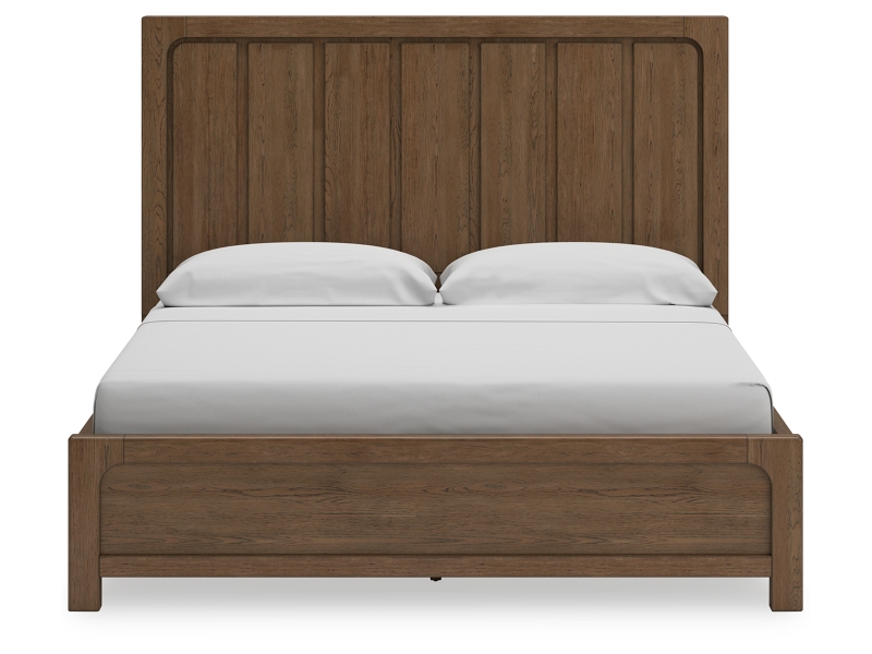 This bedroom package sits comfortably at the intersection of modern lodge and farmhouse aesthetics. Your warm and welcoming disposition is reflected in the charming architectural elements and light brown glazed finish. Even with its poise, the set remains practical, defining your bedroom with reliable function and style.