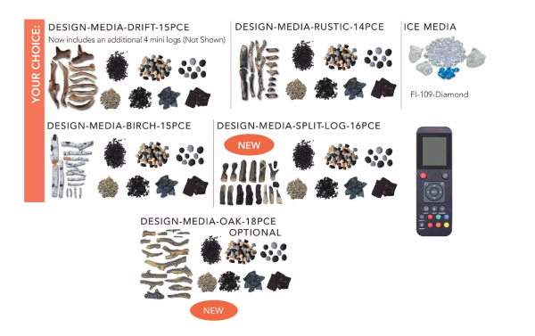 The BI-DEEP-XT series comes with your choice of a 15 piece log set or ICE media kit including large glass chunks, clear and blue diamond media.