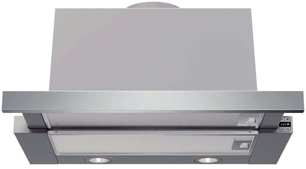 Bosch Benchmark™ Series 24" pull-out hood allows the user to close the hood when not in use. It features 400 CFM integrated blower, dishwasher safe aluminum mesh filters and 2 halogen lights.