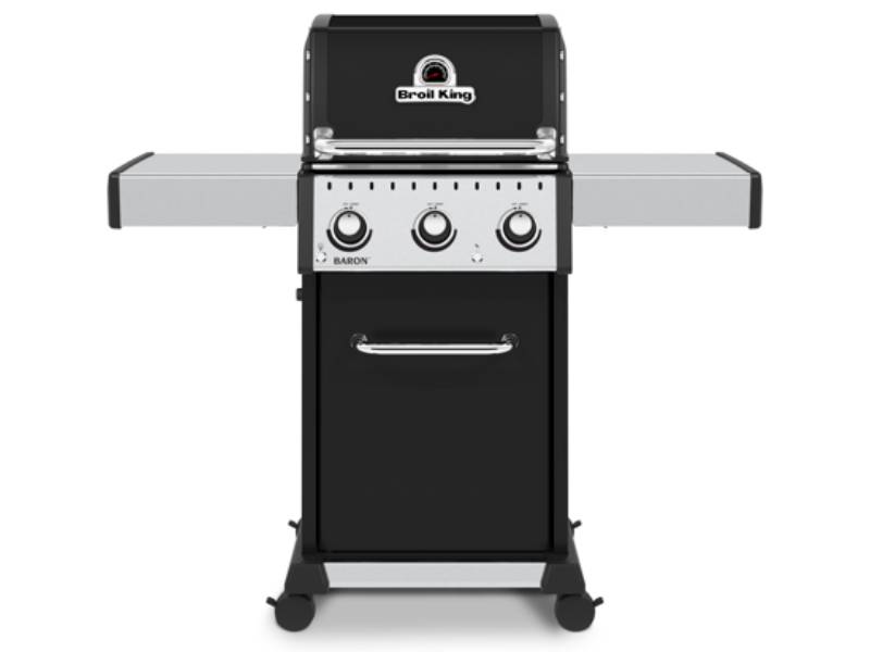 The Baron™ 320 PRO features 350 sq. in. primary cooking surface and includes a durable cast aluminum oven, 3 stainless steel Dual-Tube™ burners, illuminated control panel lights, stainless steel Flav-R-Wave™ cooking system, and electronic ignition. The 320 PRO features stainless steel 8 mm rod cooking grids, stainless steel warming rack, stainless steel drop-down side shelves and enclosed black cabinet base.