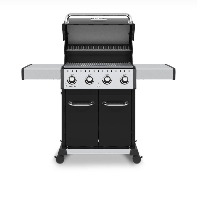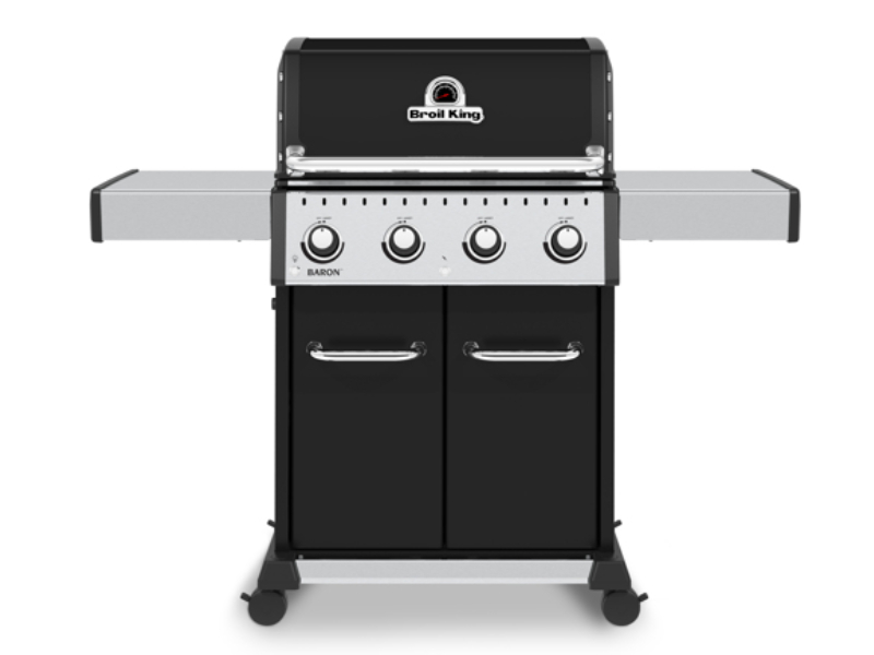 The Baron™ 420 PRO features 460 sq. in. primary cooking surface and includes a durable cast aluminum oven, 4 stainless steel Dual-Tube™ burners, illuminated control panel lights, stainless steel Flav-R-Wave™ cooking system, and electronic ignition. All 400 PRO series include stainless steel 8 mm rod cooking grids, stainless steel warming rack, stainless steel drop-down side shelves and enclosed black cabinet base.