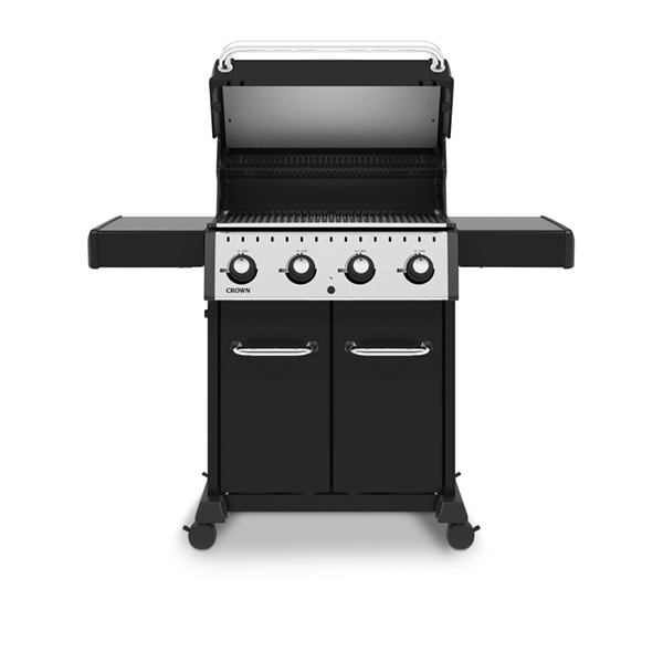 The Broil King Crown 400 Series features 460 sq. in. primary cooking surface and includes a durable cast aluminum oven, 4 stainless steel Dual-Tube™ burners, stainless steel Flav-R-Wave™ cooking system, and electronic ignition. All Crown 400 series include heavy-duty 3-position cast iron cooking grids, black drop-down side shelves and enclosed black cabinet base.