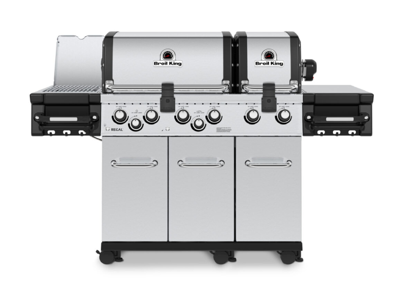 The Regal™ S 690 Pro Infrared features two totally independent ovens with a total of 1030 sq. in. of cooking space including two stainless steel warming racks, four solid 9 mm stainless steel cooking grids, 2 reversible heavy-duty cast iron cooking grids, stainless steel Flav-R-Wave™ cooking system, 6 stainless steel Dual-Tube™ burners, stainless steel side shelves, an enclosed cabinet base and built-in control knob lights.