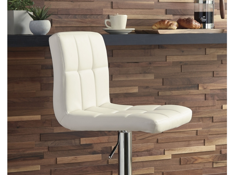Here's a bar stool that rises to the occasion. It is sleek and modern with a chrome-tone finish. Square-tufted, bone-colored faux leather upholstery makes this barstool pop. It easily adjusts from counter to pub height making it as versatile as it is attractive. This tall swivel barstool is a perfect seat for any trendy home bar or game room.