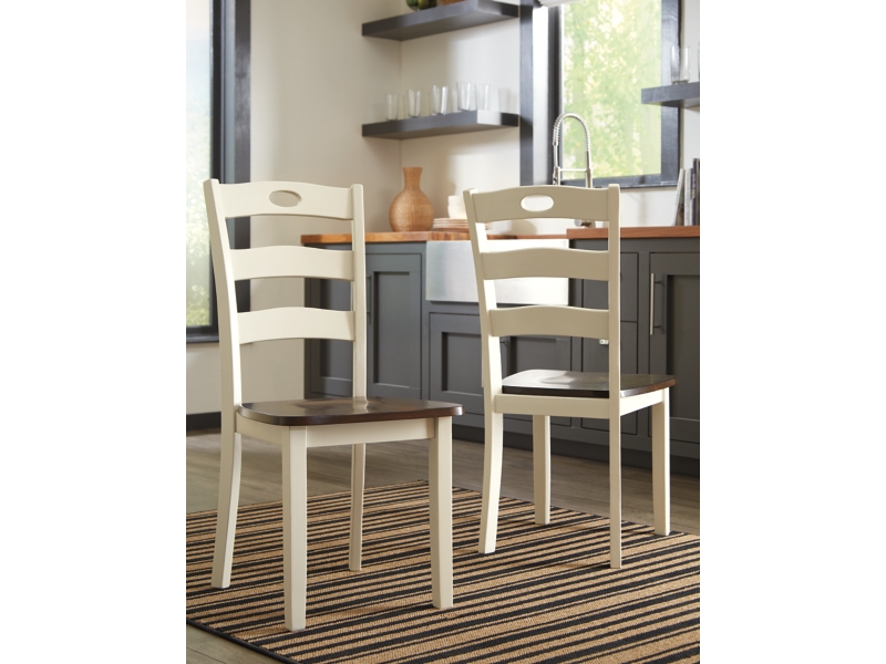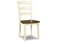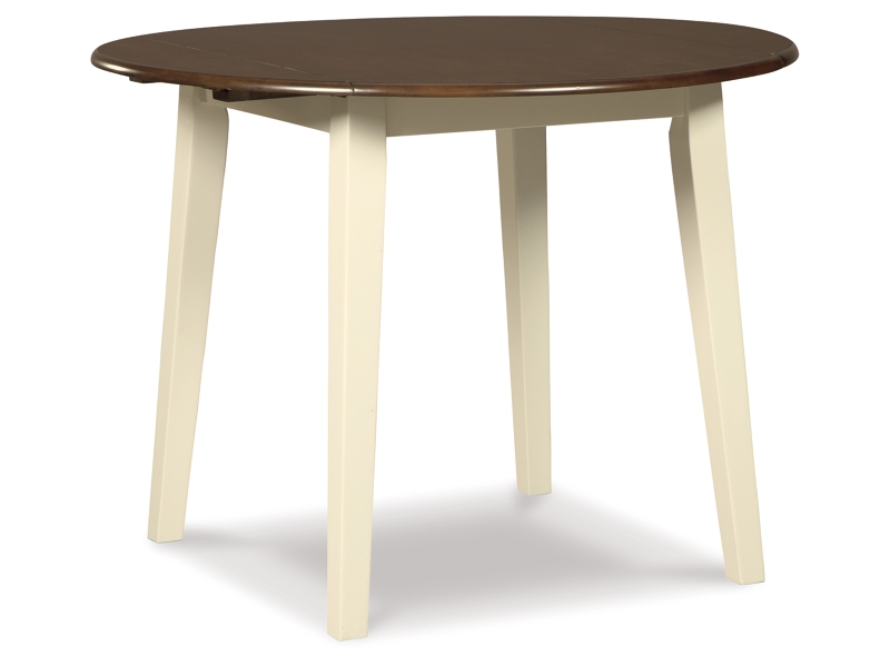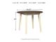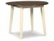Made with Birch veneers and select hardwood solids in a distinctive two-tone cottage finish. Cream table base and chair frame with medium brown color table tops and chair seats. Updated cottage styling, table has arched aprons and chair has pierced ladder back design. Chair has contoured seat for added comfort. D335-15 small round dining table features drop leaves for smaller space dining. Chair has a pierced ladder-back design.