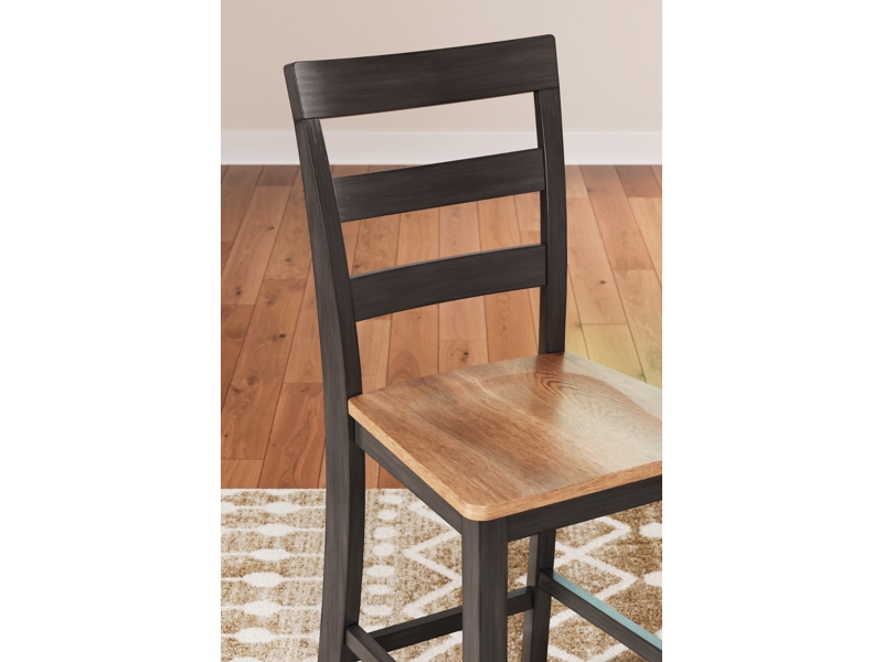 Casual Lifestyle design. Made with Mango veneer, MDF substrate and rubberwood solids. Two-tone finish contrasts a light natural Mango wood finish with a dark casual brown. Tables feature a butcher block veneer top, and tapered leg design with a through tennon look. The dining chairs and barstools features a simple ladderback design with a contoured wood seat finished in a two-tone finish. Bench features through tennon look and the contrasting seat and legs complement any space. Also available in Mango/white [D398-XX], Mango/blue [D399-XX] or Mango/green [D401-XX]. Tables feature a butcherblock veneer top. D396-223/-325 sets feature a timeless tapered leg design with a through tennon look. D396-15 drop-leaf table is 42" round with two 8.5" leaves that allow the table to convert from a space saving 2-person table to a larger 4-person table. D396-13 counter height table has storage shelves conveniently located on one end with a sturdy stretcher to add support to the tapered legs on the other end. The chairs and stools in this collection feature a casual ladder back design and a 2-tone finish with a contoured mango veneer seat to match the table tops. All chairs and stools in this collection have adjustable levelers.