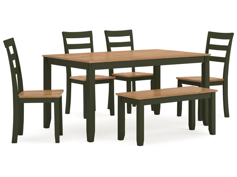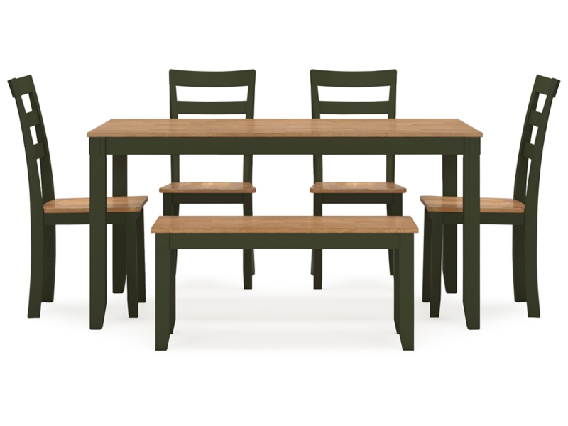 Complement your home’s simply relaxed sensibility with this dining table, chairs and bench. A charming green hue offers a chic contrast to the natural wood tone, for a casual look that vibes with a variety of aesthetics. Whether you're sipping your morning coffee, settling in for dinner or working from home, this set is smartly designed for everyday comfort and style.