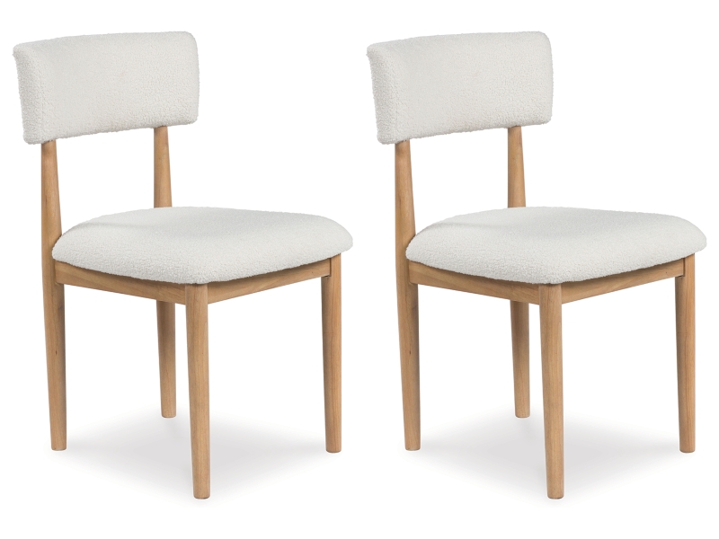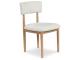 Casual lifestyle design with a modern vibe. Made with hardwood solids, decorative melamine laminate, and MDF substrates. Finished in a natural Oak color for a casually relaxed setting. D427-15 round dining table features a contrasting replicated white marble top. D427-02 upholstered dining chair made with solid wood frames with a cushioned seat and back rest covered in a white colored boucle fabric.