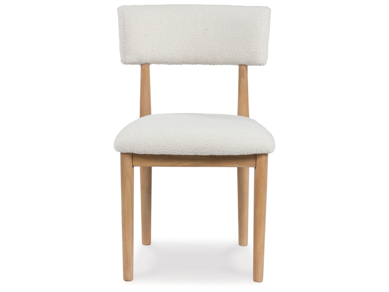 Clean lines meet cool curves with this dining chair. Simple round post legs and a natural finish lend a modern vibe, while softly textured upholstery tempts you to sit and stay awhile. What a delicious choice for a dining room update.