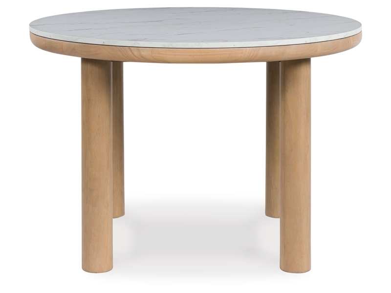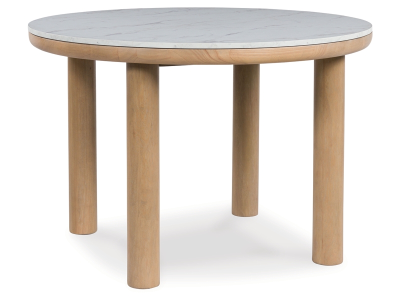Clean lines meet cool curves with this dining table. Chunky round post legs and a natural finish lend a modern vibe, while a replicated white marble top completes the casual lifestyle design. What a delicious choice for a dining room update.