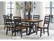 Modern Farmhouse design. Made with hardwood solids, Mango wood veneer and MDF substrate. Two-tone finish scheme featuring a rich deep brown wood tone top and seat contrasted with warm satin black frames. The D634-35 table top features a butcher block veneer pattern with butterfly leaf to extend the dining space to seat up to 8. Stylish solid wood chair frames with a modern ladder back design and contoured seat. Matching bench for additional seating options. D634-13 counter height gathering table features a 38" x 60" top set on a storage pedestal for convenient access to extra storage space. D634-124 counter stool has a matching two-tone finish with solid wood frames and a contoured seat for added comfort. D634-230 barstools are made with hardwood frames with contoured swivel seats and integrated foot rest. D634-65 bar features a raised serving area, lower work surface with inset Melamine laminate, large open storage capacity, three reversible wine shelves, stemware rack and two accessory drawers with heavy duty ball-bearing side glides. The buffet features three accessory drawers over three storage cabinets, each with two adjustable shelves.