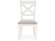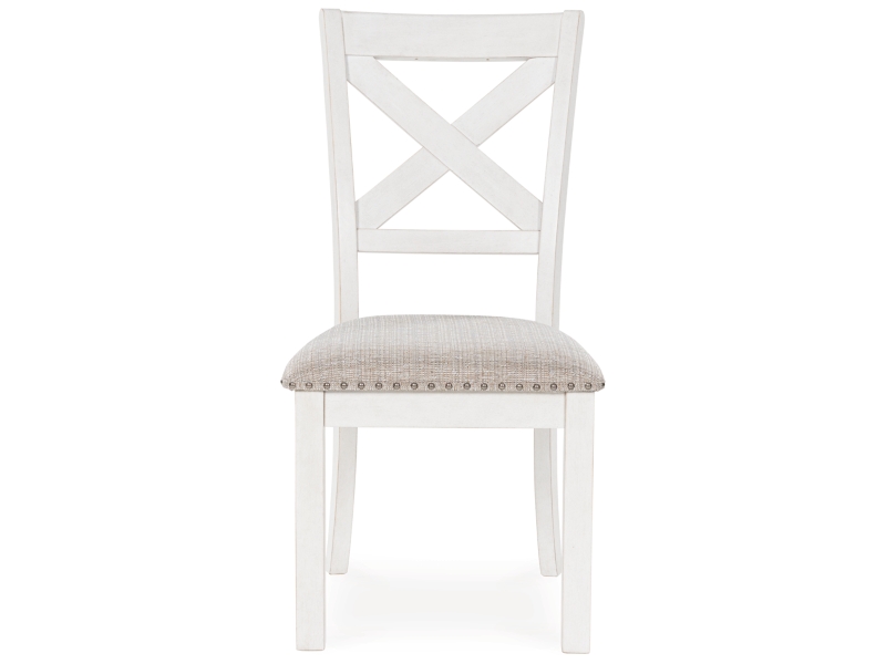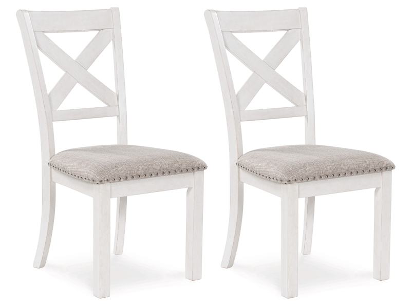 This set of 2 dining chairs is sure to impress come mealtime. With its antiqued white finish, classic country X-back and light gray upholstery with nailhead trim, modern farmhouse-style dining has never been so fashionable. All that's missing is you and your family.