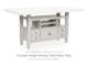Modern farmhouse styling. Made with Rubberwood solids, Ash veneer and MDF substrates. Antiqued white finish with wonderful grain textures contrasts beautifully with the light gray upholstered seats and nail-head trim accents. D642-32 counter height table features a planked effect on the top with two 12" leaves that extend the table to 86" overall. D642-124 counter height barstool has classic farmhouse X-back with contrasting light gray cover with nail-head trim. D642-09 counter height bench for alternative seating options. D642-13T/B counter height island table is loaded with storage features including 10 bottle wine storage shelves [one is reversible], lower door cabinet accessible from both sides, and 2 large capacity pass-through drawer bins. D642-60 server features plank-effect cabinet doors and top, antiqued white finish and satin nickel color hardware. Includes 4 cabinets, lower cabinets have one adjustable shelf each, two drawers. D642-45 dining table features a planked effect on the top with two 12" leaves that extend the table to 86" overall. D642-01 has classic farmhouse X-back with contrasting light gray cover and nail-head trim.