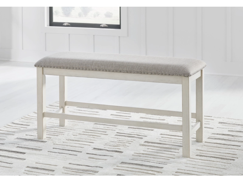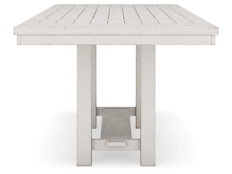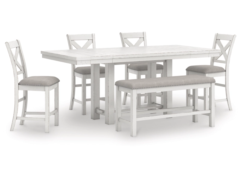 This counter height dining table is sure to impress come mealtime. With its antiqued white finish and a planked effect tabletop that extends for additional seating, farmhouse-style dining has never been so fashionable. All that’s missing is you and your family. 4 barstools and bench included.