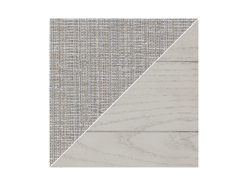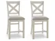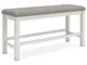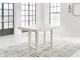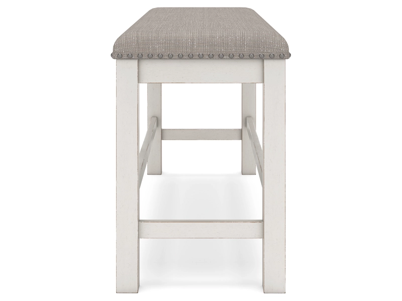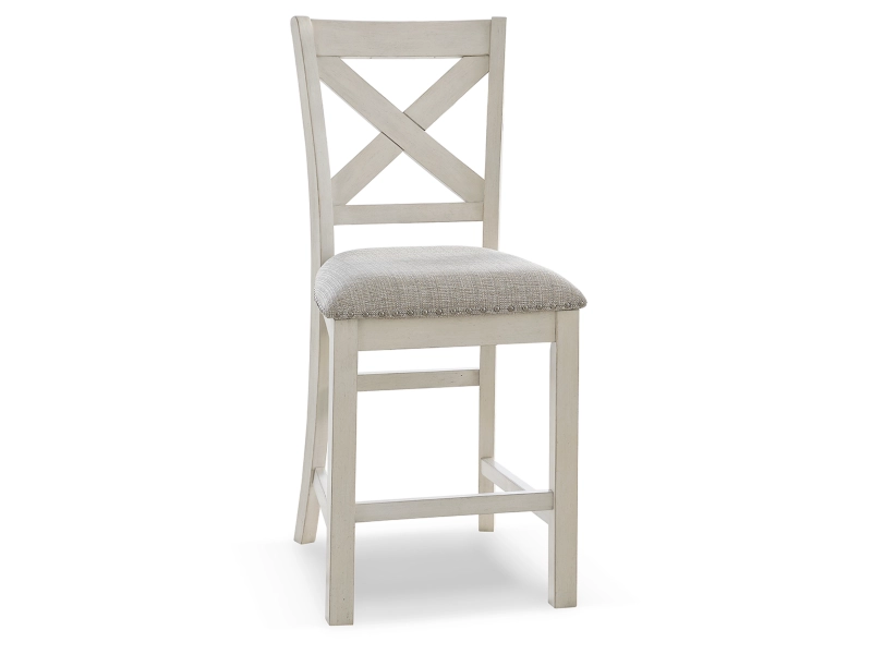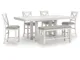 Modern farmhouse styling. Made with Rubberwood solids, Ash veneer and MDF substrates. Antiqued white finish with wonderful grain textures contrasts beautifully with the light gray upholstered seats and nail-head trim accents. D642-32 counter height table features a planked effect on the top with two 12" leaves that extend the table to 86" overall. D642-124 counter height barstool has classic farmhouse X-back with contrasting light gray cover with nail-head trim. D642-09 counter height bench for alternative seating options. D642-13T/B counter height island table is loaded with storage features including 10 bottle wine storage shelves [one is reversible], lower door cabinet accessible from both sides, and 2 large capacity pass-through drawer bins. D642-60 server features plank-effect cabinet doors and top, antiqued white finish and satin nickel color hardware. Includes 4 cabinets, lower cabinets have one adjustable shelf each, two drawers. D642-45 dining table features a planked effect on the top with two 12" leaves that extend the table to 86" overall. D642-01 has classic farmhouse X-back with contrasting light gray cover and nail-head trim.