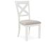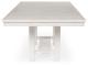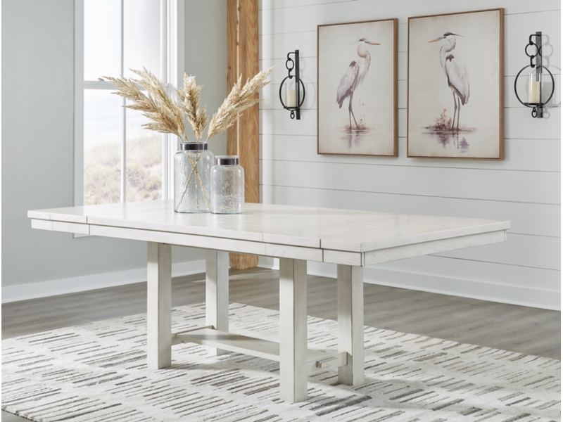 Modern farmhouse styling. Made with Rubberwood solids, Ash veneer and MDF substrates. Antiqued white finish with wonderful grain textures contrasts beautifully with the light gray upholstered seats and nail-head trim accents. D642-32 counter height table features a planked effect on the top with two 12" leaves that extend the table to 86" overall. D642-124 counter height barstool has classic farmhouse X-back with contrasting light gray cover with nail-head trim. D642-09 counter height bench for alternative seating options. D642-13T/B counter height island table is loaded with storage features including 10 bottle wine storage shelves [one is reversible], lower door cabinet accessible from both sides, and 2 large capacity pass-through drawer bins. D642-60 server features plank-effect cabinet doors and top, antiqued white finish and satin nickel color hardware. Includes 4 cabinets, lower cabinets have one adjustable shelf each, two drawers. D642-45 dining table features a planked effect on the top with two 12" leaves that extend the table to 86" overall. D642-01 has classic farmhouse X-back with contrasting light gray cover and nail-head trim.