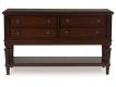 Traditional styling. Made with hardwood solids, Cherry veneer, cast resin components and engineered wood substrates. Classic Cherry brown finish. D764-35 oval to round dining table with 24" removable leaf extends to 72" to comfortably fit up to 6 seats. The table top features a traditional matched veneer pattern and reeded legs. D764-01 chair features a traditional silhouette made with solid wood frames and cast resin components. A cushioned seat is covered with a stylish textured tan woven polyester fabric. Chairs in this collection have adjustable levelers. D764-60 server features four drawers with dovetail construction, fully finished interiors and heavy duty ball-bearing side glides. A large open shelf below for display items.