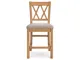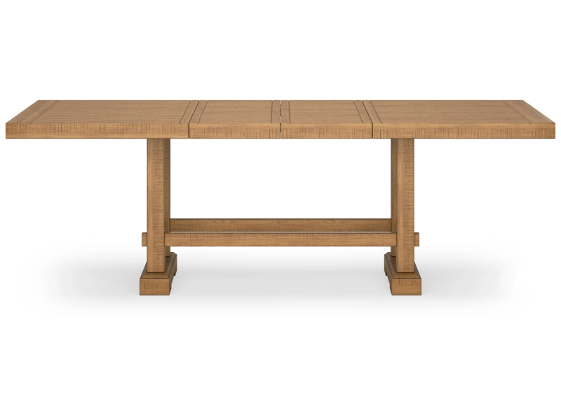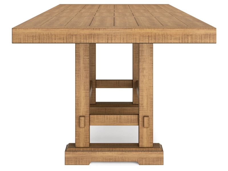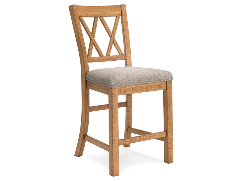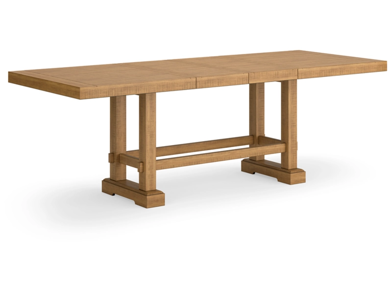 Casual Rustic design. Made with Rubberwood solids, distressed Pine veneers and MDF substrates. Distressed light brown Pine finish. Counterheight extension table with two center leaves, can sit up to 10 people. Table top with planked effect with distressing, double trestle base with a solid wood stretcher. Counterheight barstool features a casual look with its double X-back design and contrasting light gray upholstered seat cushion. Dining bench offers great alternate seating, cushion is covered in a textured fabric. Server features casual rustic design with planked effect on the chunky top, simple long black metal bar-pull adds contrast to the rustic finish. Plenty of storage with 4 door cabinet with 2 adjustable wood shelves, and two drawers with fully finished drawer boxes with ball-bearing side guides and black felt bottom.