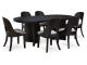 Inspired by art deco design, this dining package makes a lasting impression in a simply stunning way. Magnificent curved silhouettes are enhanced with a rich layered black finish and neutral upholstery. This set makes the contemporary statement you’ve been seeking to elevate late-night dinners and full-on family feasts.