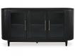 Contemporary lifestyle design. Made of hardwood solids and Oak veneer. Rich layered black finish on textured wood grain surface. Collection is inspired by Art Deco designs with trend-right curved silhouettes. Table features an oval design and architectural inspired table pedestal. Can seat up to 8 people. Dining chair features an ultra sleek bent plywood back for contoured comfort and a cushion seat covered in a herringbone patterned gray fabric. D821-02A fully upholstered bucket chair is made with engineered wood frames and covered with an ivory colored bouclé fabric. Set on casters for easy mobility. Server features 3 glass cabinet doors, interior shelving, rounded case design and tapered legs.