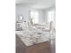 Contemporary Glam design. Made with solid wood components, MDF substrate and decorative PVC laminate. Bright white, smooth lacquer finish is beautifully accented with contemporary rhinestone frames and textured PVC drawer fronts. Table features rhinestone and textured PVC framing with glass tops for visual interest. 18" removable leaf, extends table to 96". Chair features contemporary shape with clean white frames and off-white cover with metallic thread accents. Server features metal bar pulls set vertically for a trend-right contemporary style. A white LED light feature adds a touch of glam to the upper valance. All chairs in this collection have adjustable levelers.
