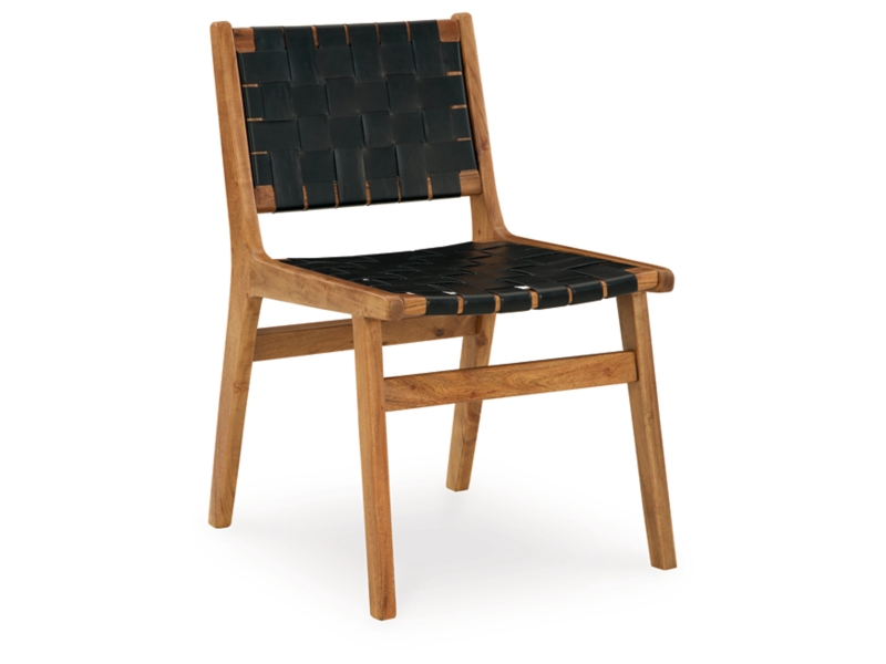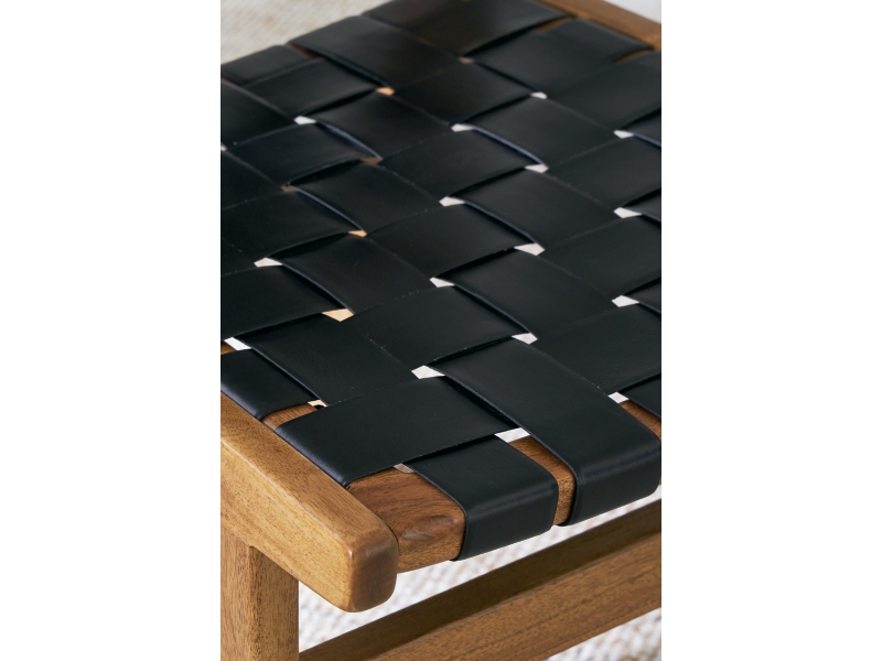 Urban Contemporary design. Made with solid Acacia wood, metal and woven leather straps. Finished in a light wood tone to enhance the wood's natural grain characteristics. The solid wood table top features a natural live edge making each table uniquely one of a kind. The dining chair is made with solid wood frames with woven black leather to create the seat and back rest. Bronze colored nail heads used to attach the leather add a touch of sophistication.