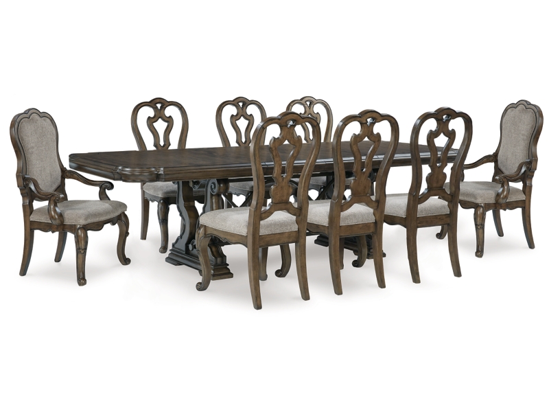 From its ornamental appliques to its large scale, this dining extension table with 8 chairs makes a bold statement. With a shapely tabletop that sits upon a double pedestal base, the opulent piece wows with stunning style. The look is timeless. The feel? Right at home.