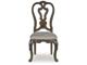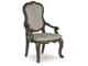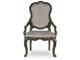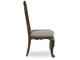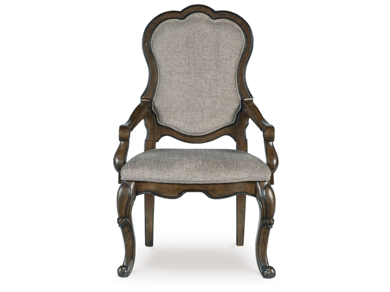 Opulent Traditional styling. Inspired by the grandeur and grace of Old World traditional style, this dining room collection is nothing short of stunning. A choice blend of materials is accented by detailed ornamental appliques large scaled decorative pilasters and ornate cabriole legs. Made with hardwood solids, oak and ash swirl veneers with MDF substrates and cast resin components. Finished in a dark brown coloration. Dining table features a shapely table top with Ash swirl borders that sits on a double pedestal base with cast ornate design and a decorative metal stretcher. The host's chair features a beautiful ornate arms with back cushion and plush seat covered in a softly textured pewter colored chenille and cabriole legs. Side chairs have a traditionally styled back rest with a cushioned seat covered in a softly textured pewter colored chenille and cabriole legs. Dining bench features ornately shaped legs, a metal accent stretcher and storage drawer with fully finished drawer interior. Complete the opulence in your dining collection with the large buffet and china deck. Buffet top is fully finished with matching ash swirl veneer border. Includes 3 cabinets with an adjustable shelf in each, and 3 fully finished storage drawers with black felt bottoms. The ornately shaped china deck features decorative beveled glass windows, mirrored back, 2 interior glass shelves, and an LED light for display. D947-50 dining table features a round table top with Ash swirl borders that sits on a pedestal base with cast ornate design.