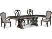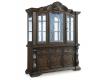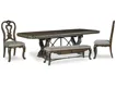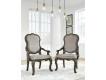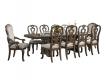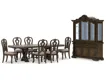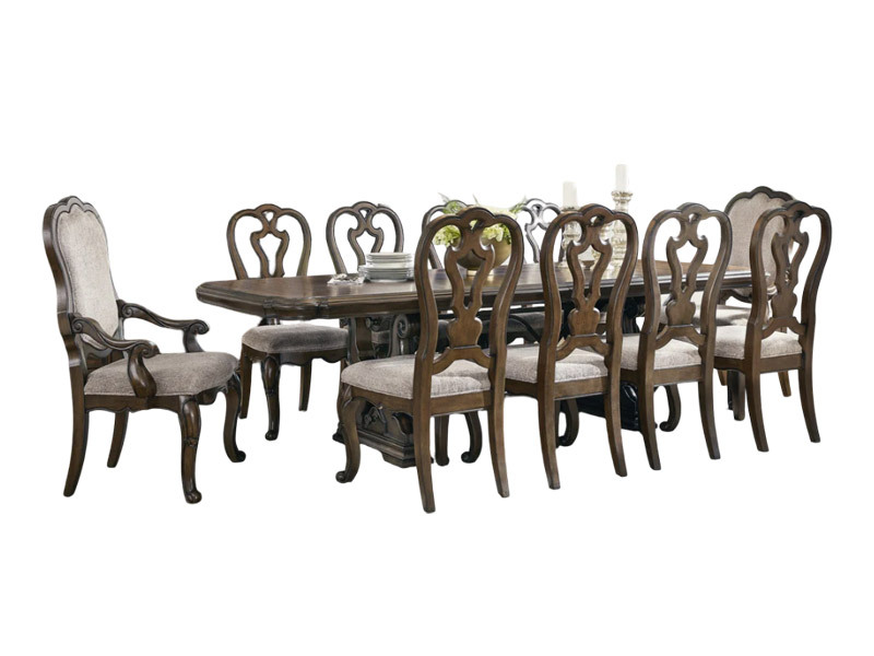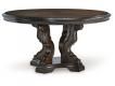 Opulent Traditional styling. Inspired by the grandeur and grace of Old World traditional style, this dining room collection is nothing short of stunning. A choice blend of materials is accented by detailed ornamental appliques large scaled decorative pilasters and ornate cabriole legs. Made with hardwood solids, oak and ash swirl veneers with MDF substrates and cast resin components. Finished in a dark brown coloration. Dining table features a shapely table top with Ash swirl borders that sits on a double pedestal base with cast ornate design and a decorative metal stretcher. The host's chair features a beautiful ornate arms with back cushion and plush seat covered in a softly textured pewter colored chenille and cabriole legs. Side chairs have a traditionally styled back rest with a cushioned seat covered in a softly textured pewter colored chenille and cabriole legs. Dining bench features ornately shaped legs, a metal accent stretcher and storage drawer with fully finished drawer interior. Complete the opulence in your dining collection with the large buffet and china deck. Buffet top is fully finished with matching ash swirl veneer border. Includes 3 cabinets with an adjustable shelf in each, and 3 fully finished storage drawers with black felt bottoms. The ornately shaped china deck features decorative beveled glass windows, mirrored back, 2 interior glass shelves, and an LED light for display. D947-50 dining table features a round table top with Ash swirl borders that sits on a pedestal base with cast ornate design.