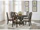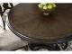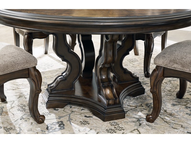 Opulent Traditional styling. Inspired by the grandeur and grace of Old World traditional style, this dining room collection is nothing short of stunning. A choice blend of materials is accented by detailed ornamental appliques large scaled decorative pilasters and ornate cabriole legs. Made with hardwood solids, oak and ash swirl veneers with MDF substrates and cast resin components. Finished in a dark brown coloration. Dining table features a shapely table top with Ash swirl borders that sits on a double pedestal base with cast ornate design and a decorative metal stretcher. The host's chair features a beautiful ornate arms with back cushion and plush seat covered in a softly textured pewter colored chenille and cabriole legs. Side chairs have a traditionally styled back rest with a cushioned seat covered in a softly textured pewter colored chenille and cabriole legs. Dining bench features ornately shaped legs, a metal accent stretcher and storage drawer with fully finished drawer interior. Complete the opulence in your dining collection with the large buffet and china deck. Buffet top is fully finished with matching ash swirl veneer border. Includes 3 cabinets with an adjustable shelf in each, and 3 fully finished storage drawers with black felt bottoms. The ornately shaped china deck features decorative beveled glass windows, mirrored back, 2 interior glass shelves, and an LED light for display. D947-50 dining table features a round table top with Ash swirl borders that sits on a pedestal base with cast ornate design.