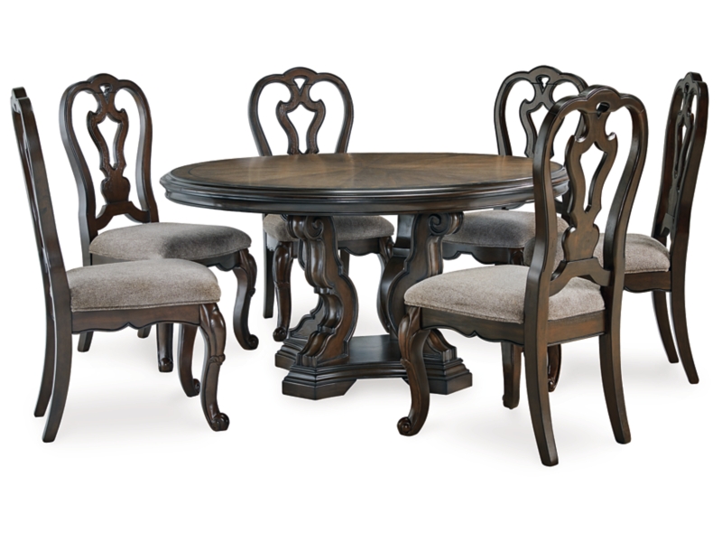 From its ornamental appliques to its large scale, this dining package makes a bold statement. With ornate details, this opulent set wows with stunning style. The look is timeless. The feel? Right at home.