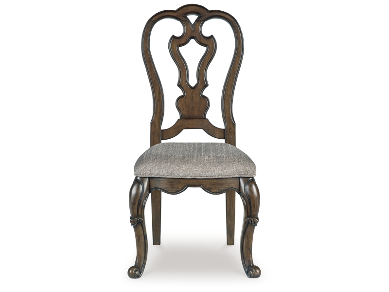 Opulent Traditional styling. Inspired by the grandeur and grace of Old World traditional style, this dining room collection is nothing short of stunning. A choice blend of materials is accented by detailed ornamental appliques large scaled decorative pilasters and ornate cabriole legs. Made with hardwood solids, oak and ash swirl veneers with MDF substrates and cast resin components. Finished in a dark brown coloration. Dining table features a shapely table top with Ash swirl borders that sits on a double pedestal base with cast ornate design and a decorative metal stretcher. The host's chair features a beautiful ornate arms with back cushion and plush seat covered in a softly textured pewter colored chenille and cabriole legs. Side chairs have a traditionally styled back rest with a cushioned seat covered in a softly textured pewter colored chenille and cabriole legs. Dining bench features ornately shaped legs, a metal accent stretcher and storage drawer with fully finished drawer interior. Complete the opulence in your dining collection with the large buffet and china deck. Buffet top is fully finished with matching ash swirl veneer border. Includes 3 cabinets with an adjustable shelf in each, and 3 fully finished storage drawers with black felt bottoms. The ornately shaped china deck features decorative beveled glass windows, mirrored back, 2 interior glass shelves, and an LED light for display. D947-50 dining table features a round table top with Ash swirl borders that sits on a pedestal base with cast ornate design.