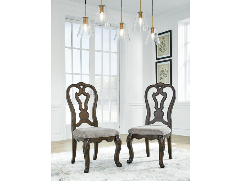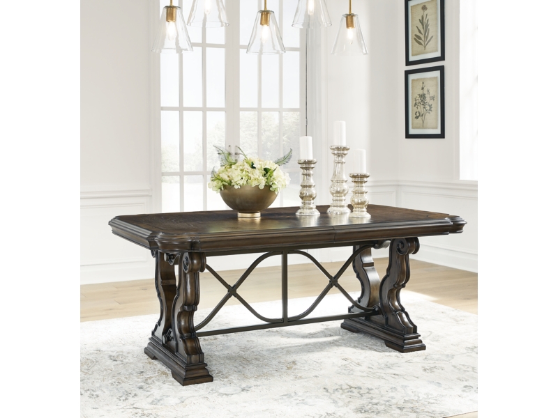 From its ornamental appliques to its large scale, this dining package makes a bold statement. With a shapely tabletop that sits upon a double pedestal base, the opulent piece wows with stunning style. The look is timeless. The feel? Right at home.