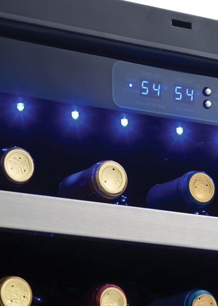 Keeping your favourite wines at the correct temperature is an easy task with this elegant freestanding wine cooler by Danby. This unit is 4.0 cubic feet in size and can comfortably store and cool up to 45 bottles on its durable black wood shelves with stainless-steel trim. The stylish tinted-glass and steel design makes it a classy addition to any room and the smart reversible hinge system allows you to adjust the door for either left or right-handed opening. The temperature is easily controlled and monitored by a precise digital thermostat with LED display while the cool blue LED track lighting beautifully showcases your wine collection. This model can be programmed anywhere between 4°C and 18°C (39.2 °F - 64.4°F) with the temperature remaining consistent due to the frost-free, fan-forced cooling system. This stunning wine cooler also comes with an 18-month warranty on parts and labour with handy in-home service.