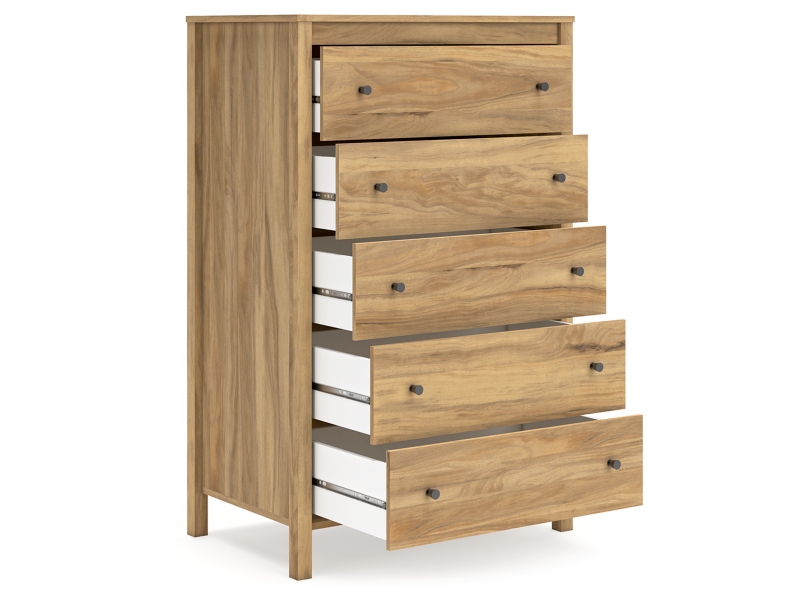- 5 smooth-gliding drawers with vinyl-wrapped sides and back for durability; ball-bearing side glides