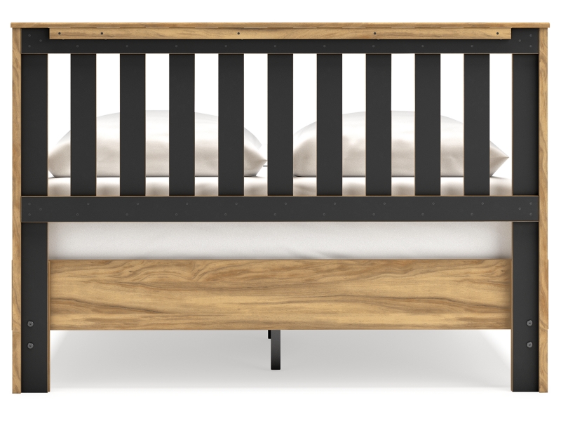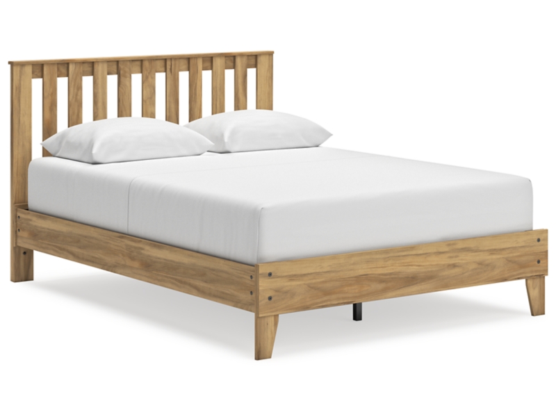 This queen platform panel bed puts the dream of a casual bedroom retreat beautifully within budget. A warm light brown finish over replicated hickory grain exudes a homey vibe. Slatted detailing on the headboard incorporates rich dimension. It’s a simply relaxed way to achieve the bedroom of your dreams without needing a foundation or box spring.