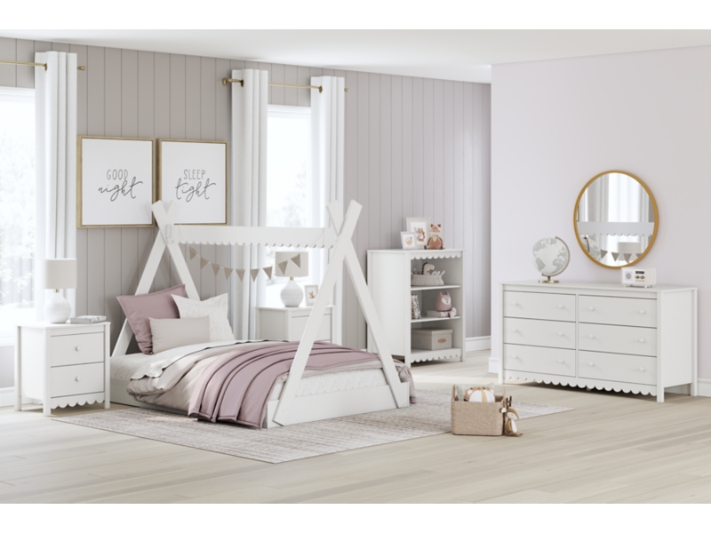 Matte white finish. Spacious drawers with ball-bearing glides offer a smooth opening and closing drawer. Cases are accented with simple white knob. Beds and cases feature a playful scallop design. Vinyl wrapped drawer sides and back for extra durability. Bookcase has adjustable shelving. Platform beds (EB1810-111,112) include footboard, rails and platform (no additional foundation/box spring needed). Twin (121) and full (122) tent complete bed in box do not require an additional foundation purchase. Safety is a top priority, clothing storage units are designed to meet the most current standard for stability, ASTM F 2057 (ASTM International). Drawers extend out to accommodate maximum access to drawer interior while maintaining safety. Assembly required.