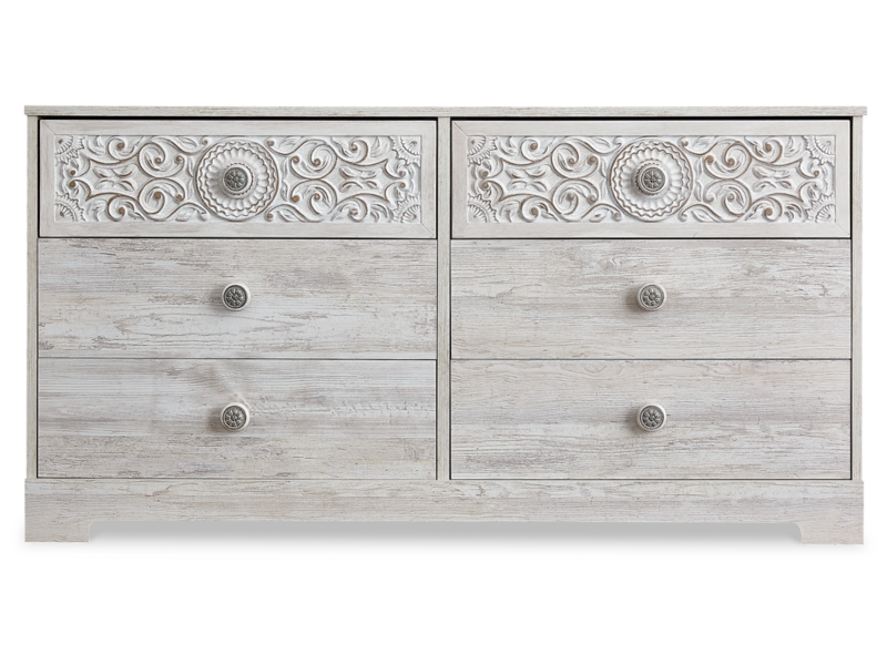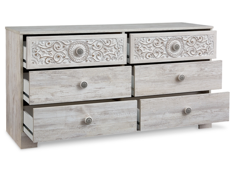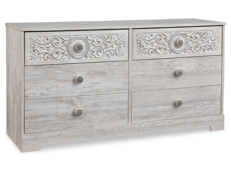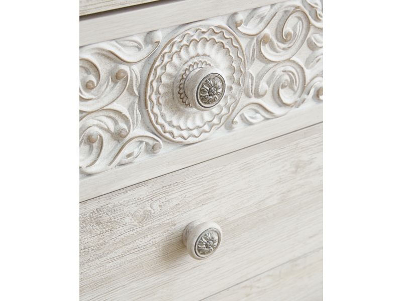 White wash replicated worn through paint with authentic touch. Cases accented with exquisite carved medallion pattern. Cases feature ornate hardware in a worn through painted look. Spacious drawers with ball-bearing glides offer a smooth opening and closing of the drawer. Vinyl wrapped drawer sides and back for extra durability. Assembly required. These express shippable cases coordinate with the express shippable B181 headboards (B181-53,87,57). Safety is a top priority, clothing storage units are designed to meet the most current standard for stability, ASTM F 2057 (ASTM International). Drawers extend out to accommodate maximum access to drawer interior while maintaining safety.