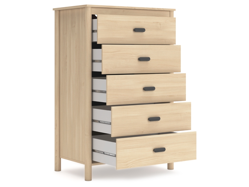 - 5 smooth-gliding drawers with vinyl-wrapped sides and back for durability