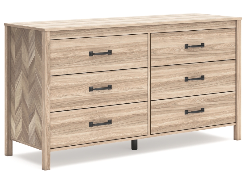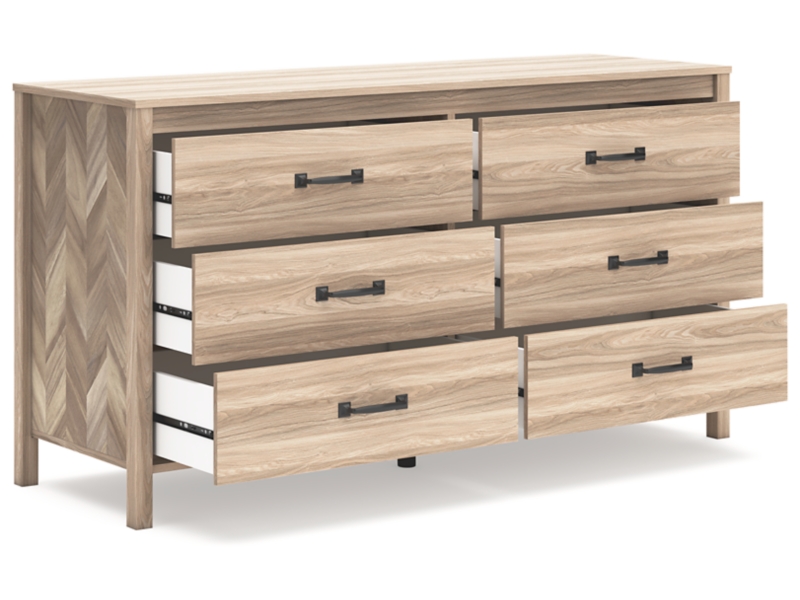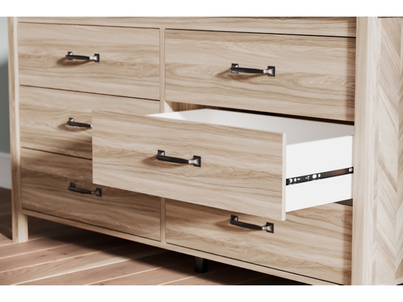 Transform your bedroom into an instant sanctuary. This dresser introduces a touch of mid-century modern style combining a two-tone finish and unique chevron pattern that is sure to enhance the design element to any bedroom. Six spacious drawers with ball bearing glides offer a smooth opening and closing of the drawers. Catering to your busy lifestyle and built to last, it is ready to assemble in the comfort of your home.