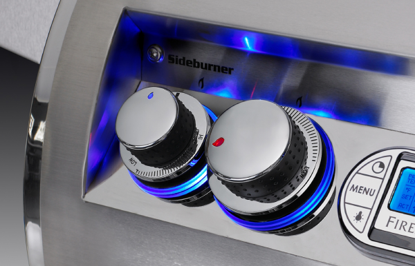 Smooth, seamless lines with polished highlights that feature back-lit knobs (at 41°) with comfort touch grips and flame icons for convenience and safety (flame turns red when on).