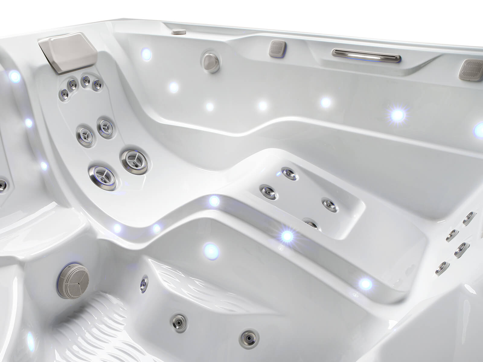 The interior lighting system features multiple points of LED light that accent the contours of the spa shell. Two exterior LED lights integrate with the front corners of the spa, creating an elegant look.